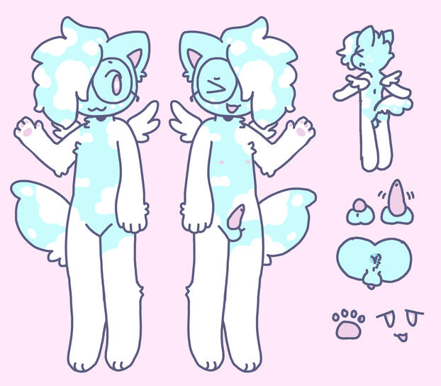 design notes: super fluffy fur and hair. wears glasses but hair is always covering one side. very soft. 3-feathered wings. cloud pattern does not have to be exact.